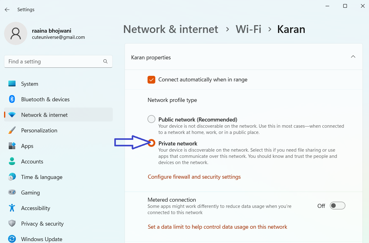 Rettelse 2: Indstil WiFi-netværket til privat for at rette det WiFi, der bliver ved med at afbryde forbindelsen på Windows 11.