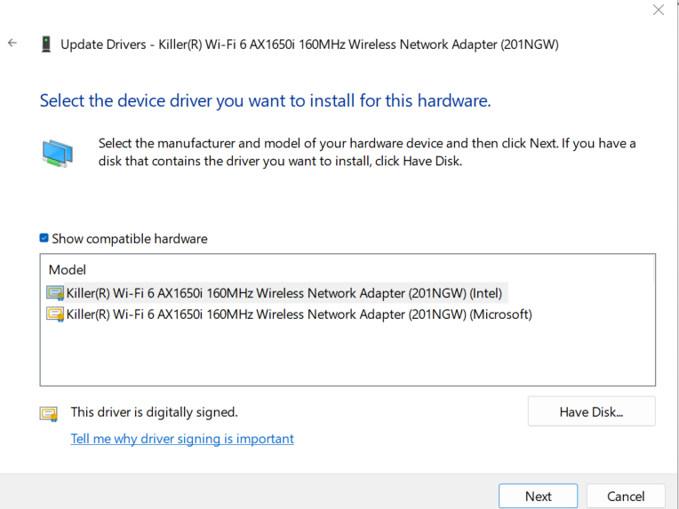5. Klik på den driver, der passer til din WiFi-adapter, og klik på "Næste".