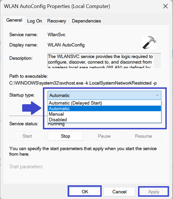 3: En promptboks vises. Under opstartstypen skal du vælge "Automatisk“.