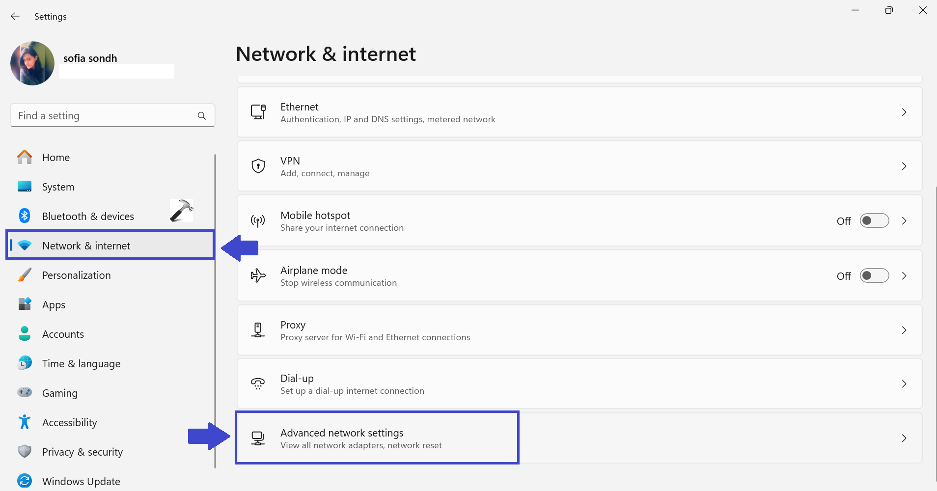 2: Gå til "Netværk og internet" og vælg "Avancerede netværksindstillinger“.