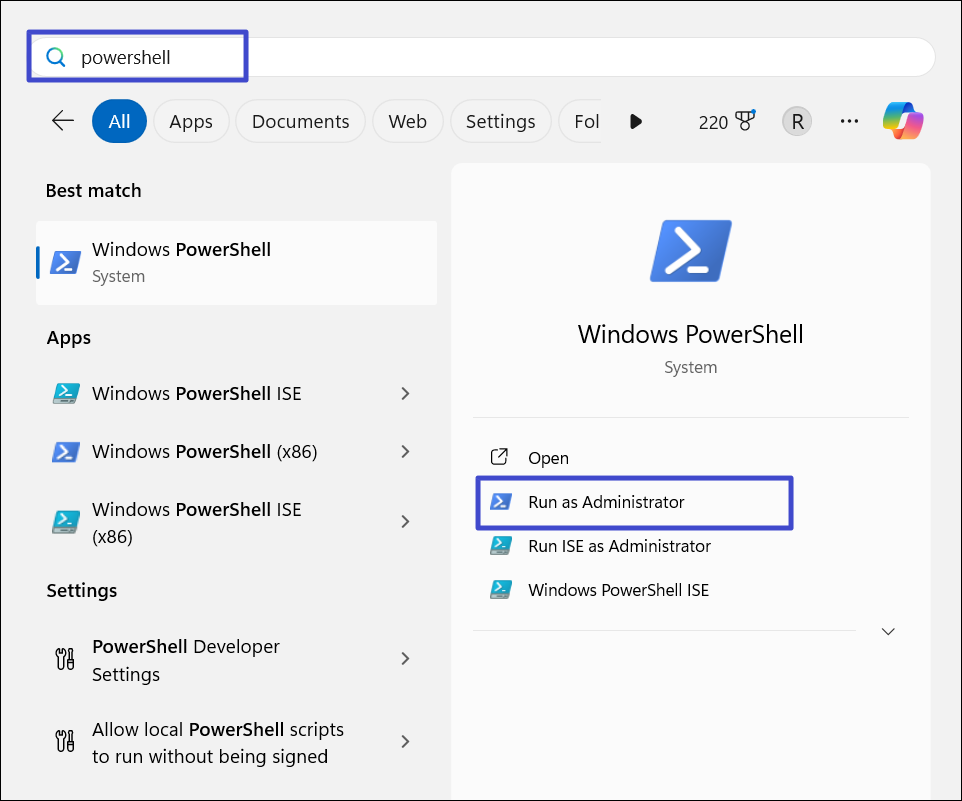 1. Søg efter Windows Powershell i søgefeltet, og højreklik på den for at vælge "Kør som administrator". Tryk på "ja" pop op-skærmen Brugerkontokontrol.