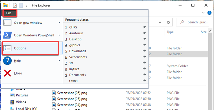 2.VælgValgmulighedermenuen i slutningen af menuerne Vis i mappevisningen.