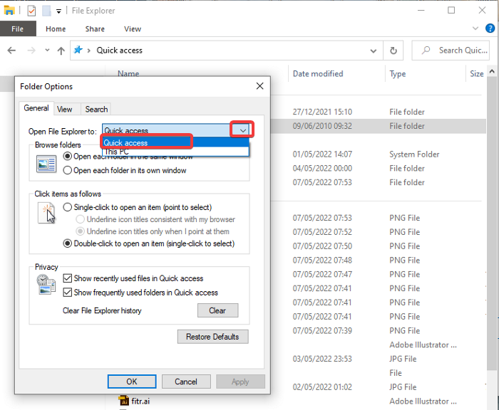 Trin 3:I det resulterende vindue skal du klikke på rullemenuen med pil foranÅbn File Explorer for atafsnit. Vælg derefterHurtig adgangskal indstilles som hovedskærmen til din filstifinder.