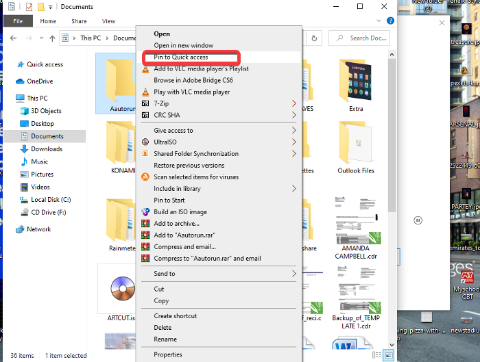 Højreklik på den mappe eller fil, du vil fastgøre, og vælgFastgør til hurtig adgang.