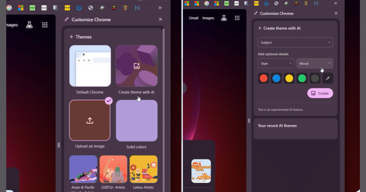 For brugere, der ønsker et unikt onlinemiljø, antyder en nylig tweak i Chrome Canary en nyskabelse, der skifter spil. Den velkendte "Wallpaper-søgning"-mulighed har udviklet sig til "Opret tema med AI", hvilket signalerer Googles udforskning af AI-drevet temaskabelse. Ved at aktivere muligheden "Udvidet temagalleri" i AI-indstillinger, vil brugerne låse op for en verden af personlige tapetmuligheder i tilpasningspanelet.