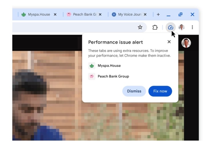 Når det er aktiveret, vil brugergrænsefladen til præstationsintervention automatisk poppe op og foreslå faner, der skal handles på i tider med dårlig ydeevne. – Mac, Windows, Linux, ChromeOS, Lacros