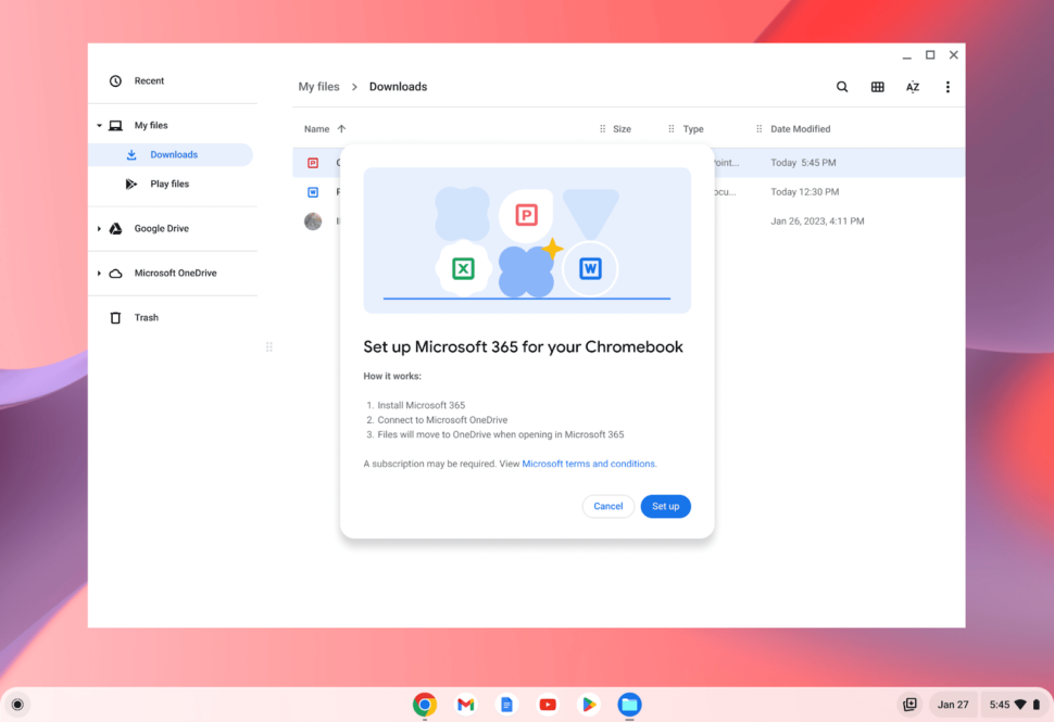 Brugere vil blive tilbudt en guidet opsætningsoplevelse, der fører dem gennem processen med at installere Microsoft 365-webappen og forbinde Microsoft OneDrive til deres Chromebook Files-app. Filer flyttes til Microsoft OneDrive, når de åbnes i Microsoft 365-appen.