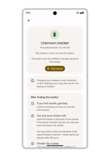 Android-enheder udstyret med den seneste opdatering vil nu give brugerne besked, hvis en "ukendt Bluetooth-tracker er adskilt fra sin ejer og er fast besluttet på at rejse med dig." Denne notifikation øger bevidstheden om potentiel uautoriseret sporing og sikrer, at brugerne holder sig informeret om deres omgivelser. FraGoogle: