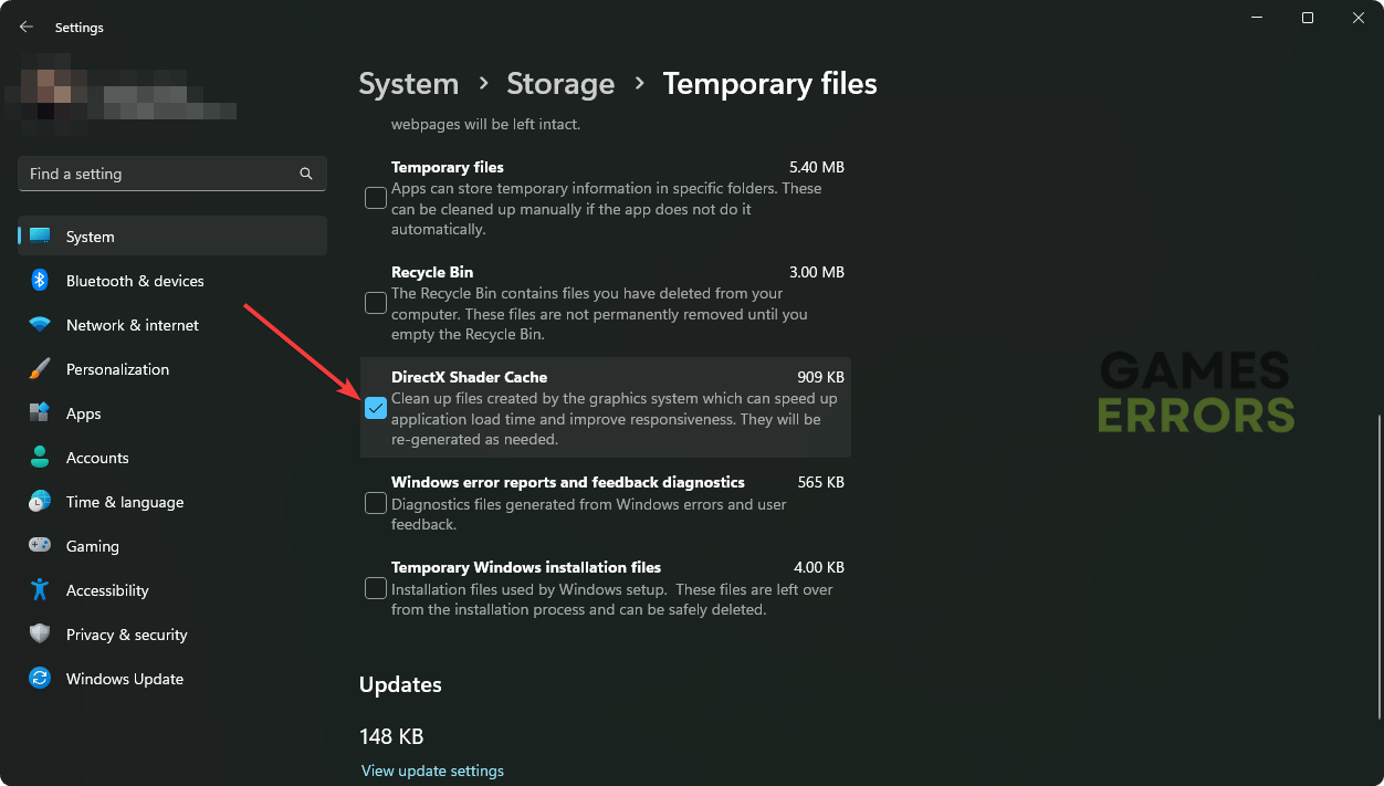 4. CheckDirectX Shader Cacheog fjern markeringen af ​​resten af ​​de andre ting.