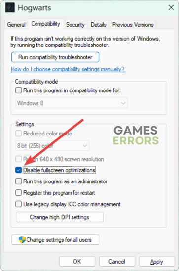 At have dine fuldskærmsoptimeringer aktiveret kan føre til mange fejl i spillet, såsom den, hvor Hogwarts Legacy sidder fast på sort skærm. Løsningen på dette problem vil dog ikke tage for lang tid, og du kan vende tilbage til at udforske troldmandsverdenen i fred.