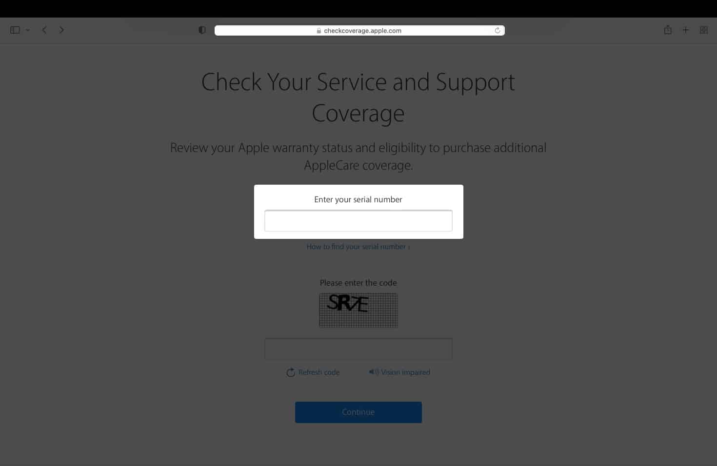 Her er en anden metode til at kontrollere din garantistatus uanset din Apple-enhed. Denne proces kræver dog, at du angiver dit serienummer. [Gå til den næste vejledning, hvis du ikke har serienummeret.]