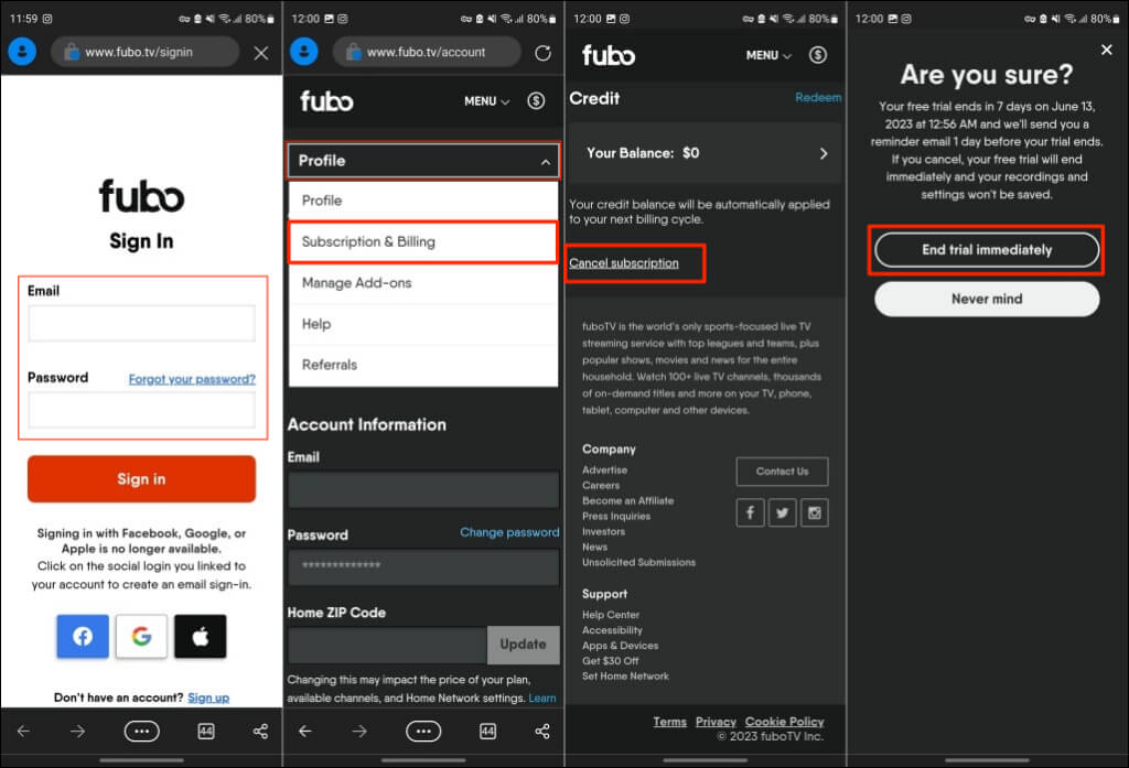 Annullering af en gratis prøveperiode tilbagekalder din adgang til fuboTV med det samme. Hvis du opsiger et standardabonnement, kan du få adgang til fuboTV, indtil din faktureringscyklus slutter.