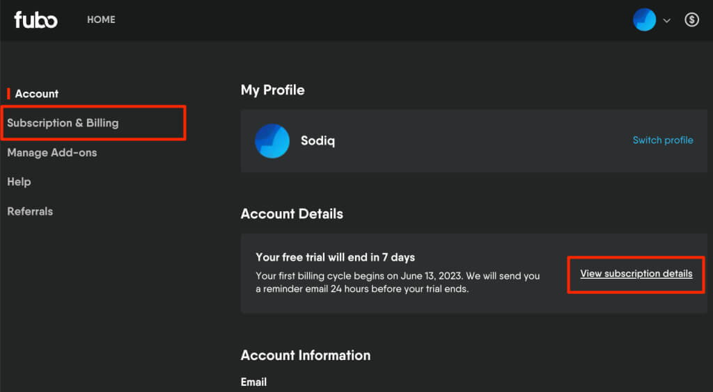 - VælgeAbonnementer og faktureringpå sidebjælken eller vælgSe abonnementsoplysningeri afsnittet "Kontooplysninger".