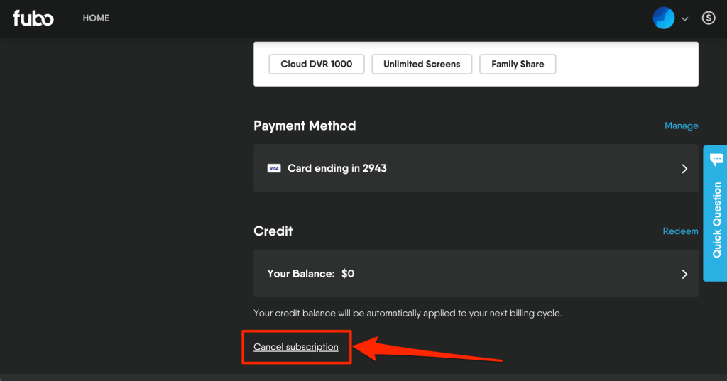 Besøg dette link (https://my.roku.com/account/subscriptions) i din webbrowser og log ind på din Roku-konto. Find din fuboTV-plan på siden, og vælgAfmeldknappen for at annullere dit abonnement.