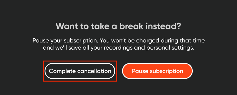 Du vil se to muligheder - Fuldstændig annullering og Sæt abonnement på pause - på bekræftelsesskærmen, hvis du har et standardabonnement.