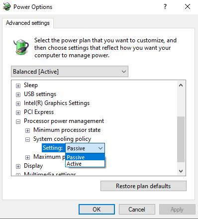 Husk, at den passive kølestrategi favoriserer batteriforbrug over ydeevne i kølesystemer. Vælg en aktiv politik for ydeevnen på din pc. Under de avancerede strømindstillinger for dine foretrukne strømplaner kan du justere politikken så ofte som nødvendigt.