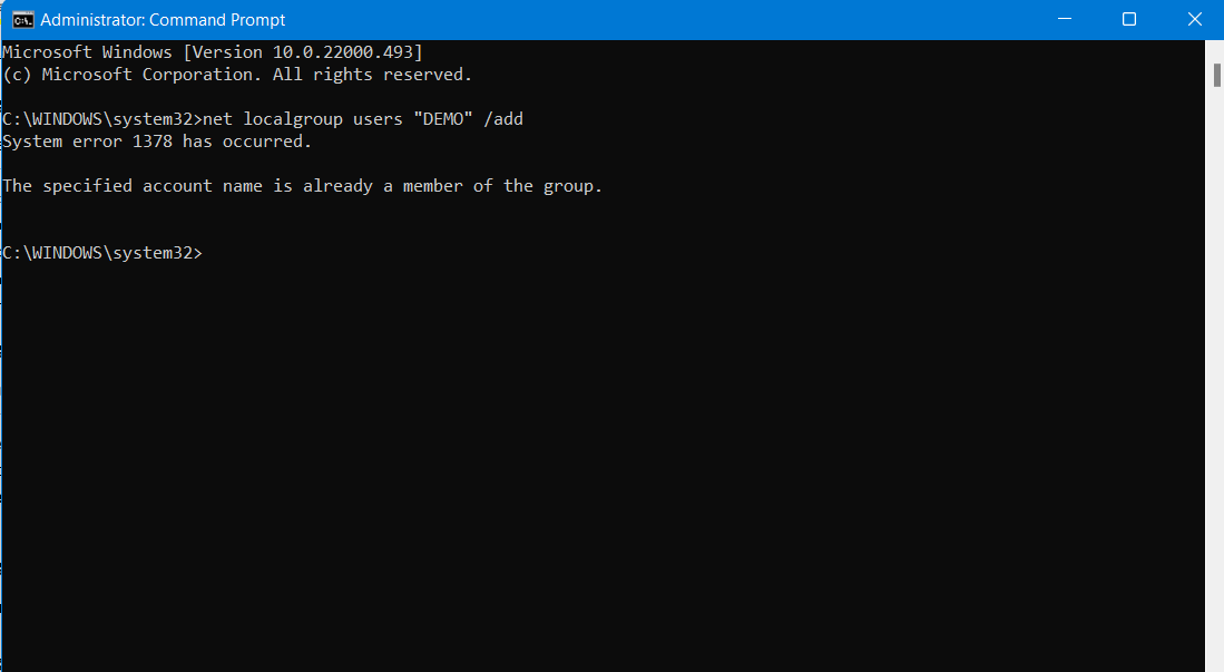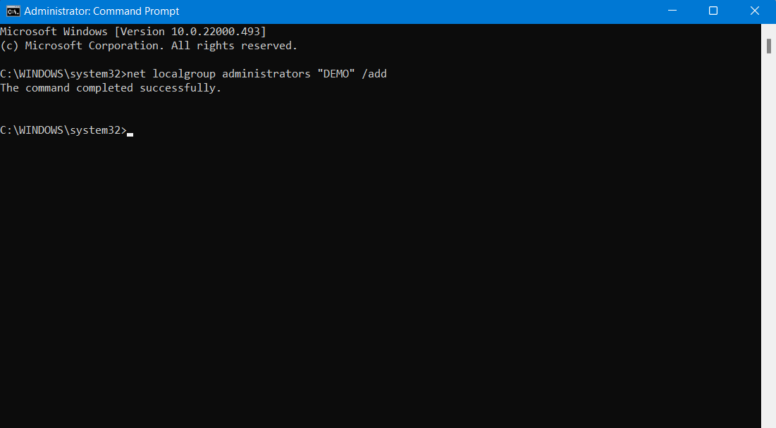 c) For at ændre kontotypen tilAdministrator, indtast følgende kommando og tryk påIndtastefter at have erstattet brugernavnet: