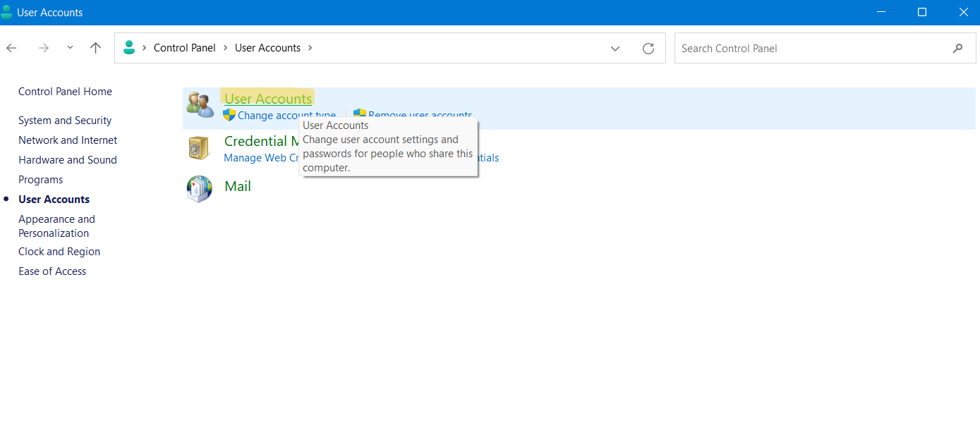 1.I første omgang, åbenKontrolpanelog vælgBrugerkonti.