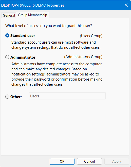 4.UnderGruppemedlemskabfanen, skal du vælge brugerkontotypen. Når du er færdig, skal du trykke påOK.