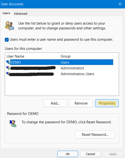 2.Derefter skal du sætte kryds i boksen ved siden afBrugere skal indtaste et brugernavn og en adgangskode for at bruge denne computerhvis ikke allerede.