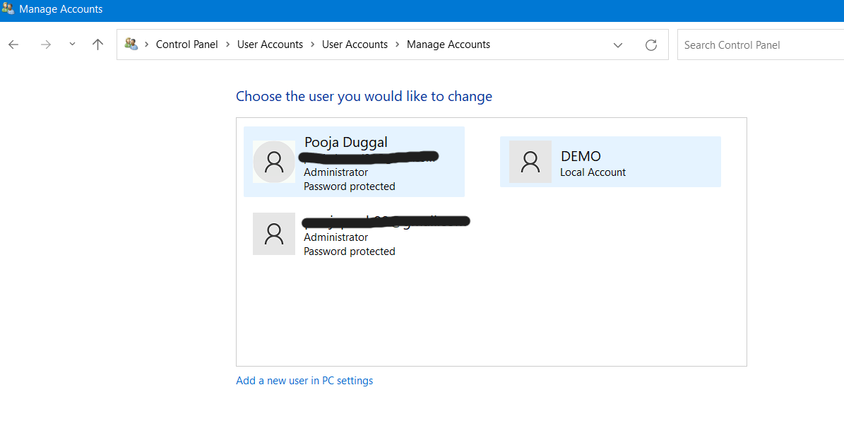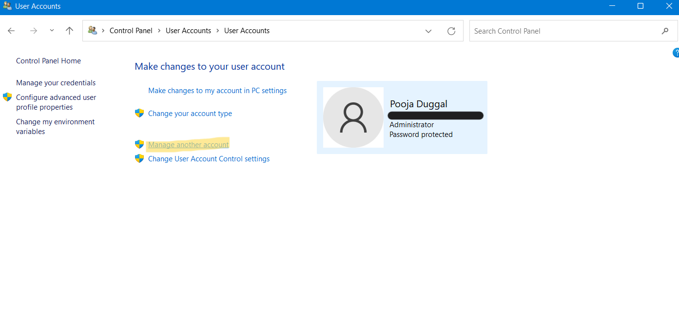 3.Klik nu påAdministrer en anden kontovalgmulighed.