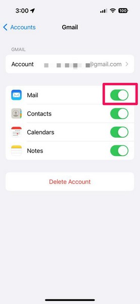 5.På den følgende side,tryk på knappenforPostapp for at deaktivere den valgte konto for e-mails.