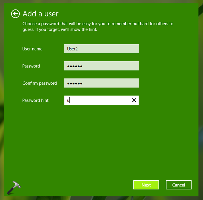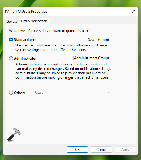 8.Som standard, når du opretter en lokal konto, er det standardkonto. Så i næste vindue, hvis du vil, kan du indstille kontotypen tilAdministrator.