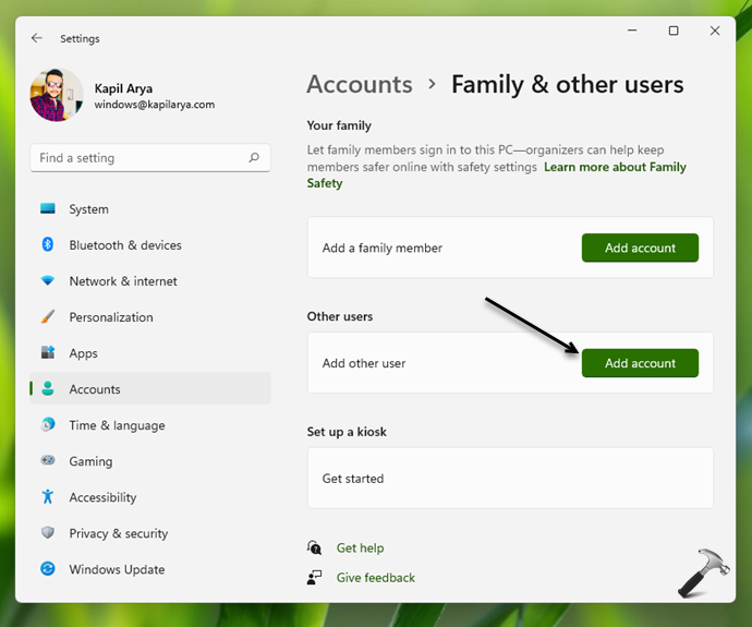 2.Gå tilKonti > Familie og andre brugere. Klik på under Andre brugereTilføj konto.