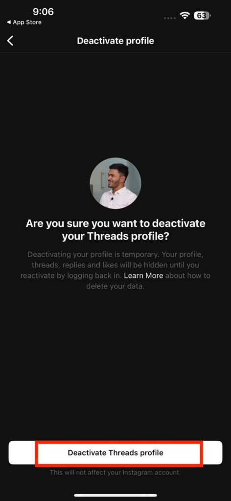 Overvej at deaktivere Threads-profilen for at blive væk fra appen