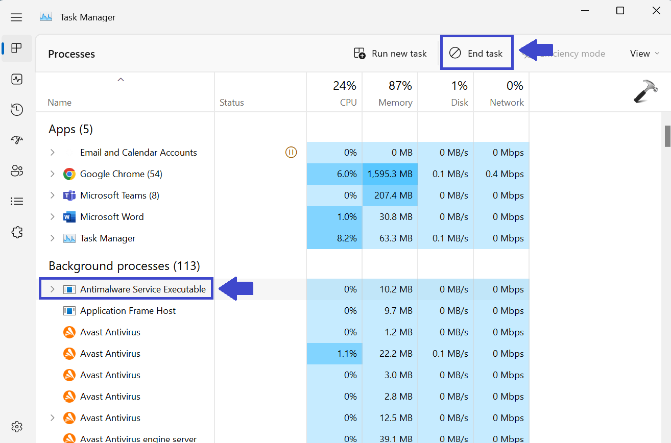 Metode 2: Deaktiver Antimalware Service Executable ved hjælp af Task Manager