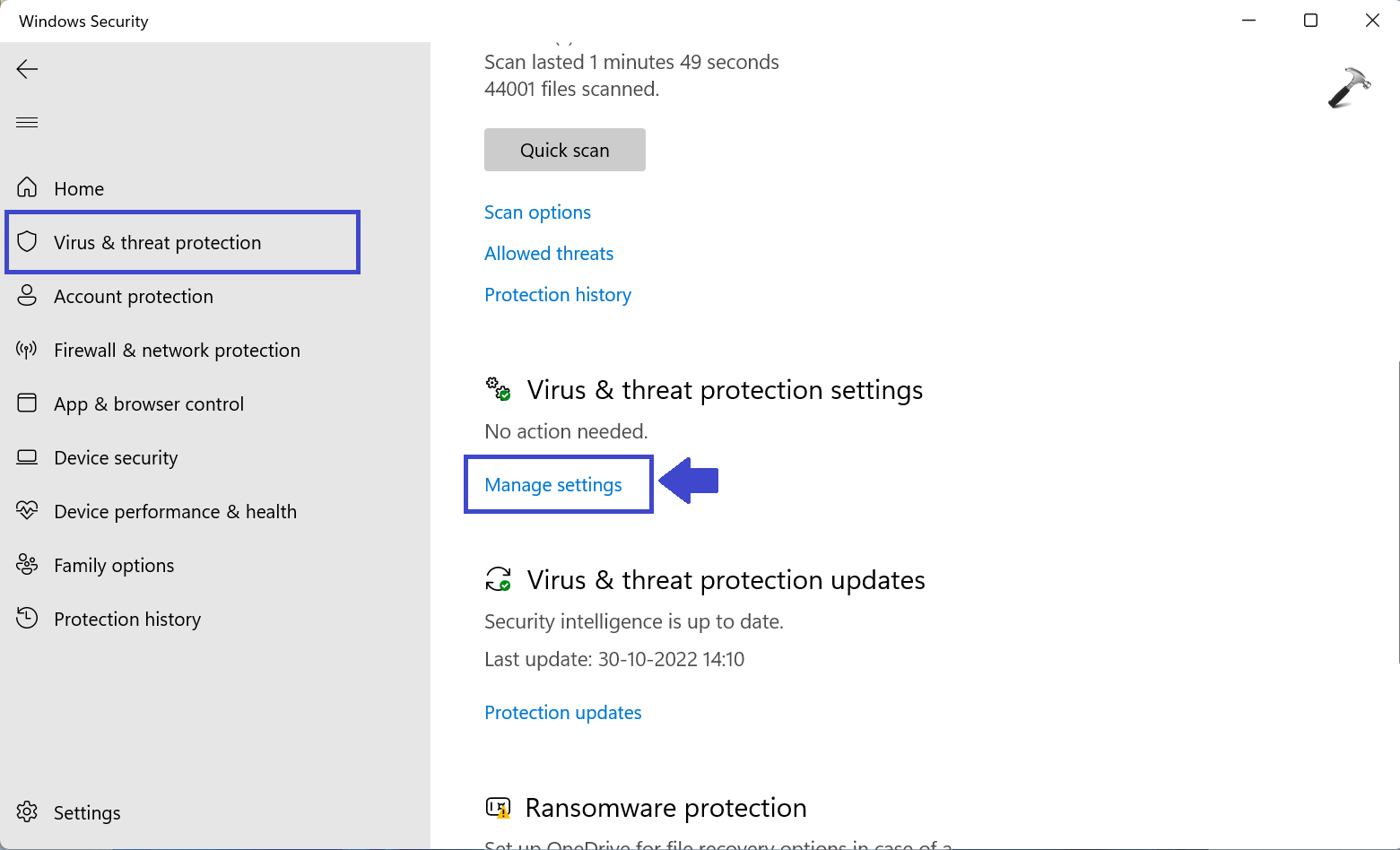 3: Vælg Virus- og trusselsbeskyttelsesindstillinger, og klik på Administrer indstillinger.