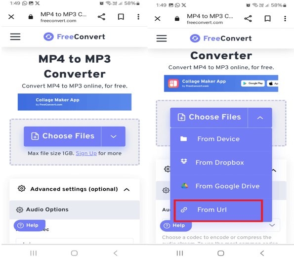 Trin 4:Tryk pånedadgående pilikon ved siden afVælg Filer> vælgeFra URLog indsæt derefter linket og tryk påIndsendknap.