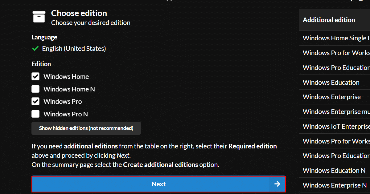 - Vælg de udgaver, der skal inkluderes i Windows 11 ISO 23H2-filen, og klik påNæsteknap.