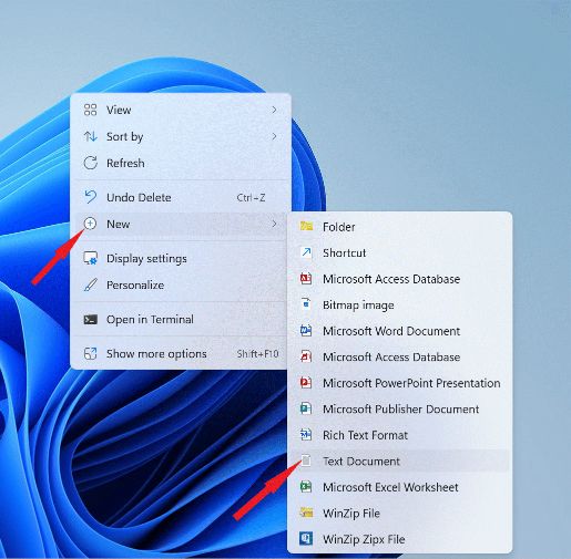 - Højreklikhvor som helst på skrivebordet og tryk påNyfra rullemenuen. og klik påTekstdokumentfor at åbne Notesblok-appen.