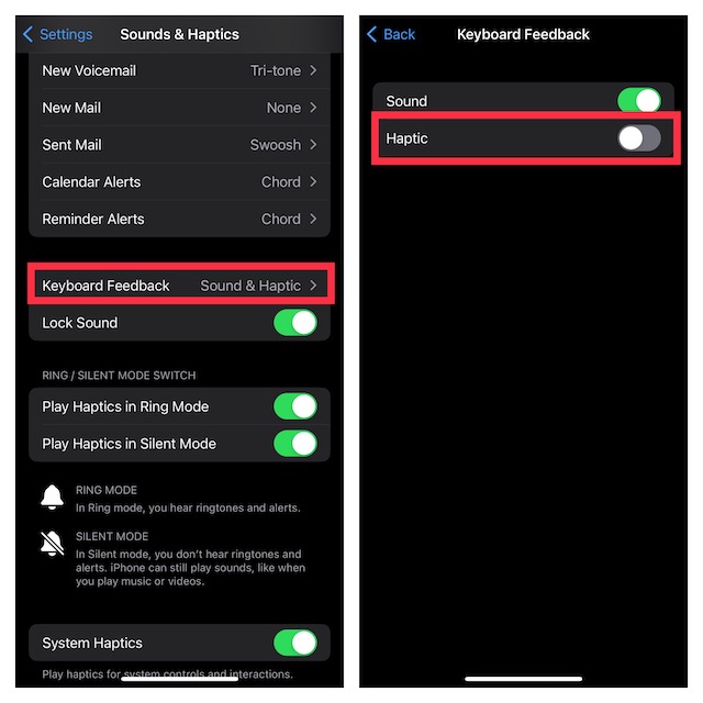 2.Tryk nu påTastaturfeedbackog sluk derefter kontakten forHaptisk, og luk derefter appen Indstillinger.