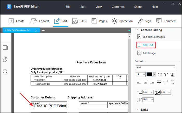 Den næste løsning på, hvordan man udfylder en PDF-formular, der ikke kan udfyldes, bruger EaseUS PDF Editor. Du kan bruge værktøjet til at udfylde data, du angiver, i tekstfelter, alternativknapper, afkrydsningsfelter og andre områder af PDF-formularer. Denne software giver dig mulighed for at tilføje tekst direkte til PDF-filer, selvom formularen ikke kan udfyldes. Du kan ændre skriftstørrelsen og farven på den tekst, du tilføjer. Her er trinene: