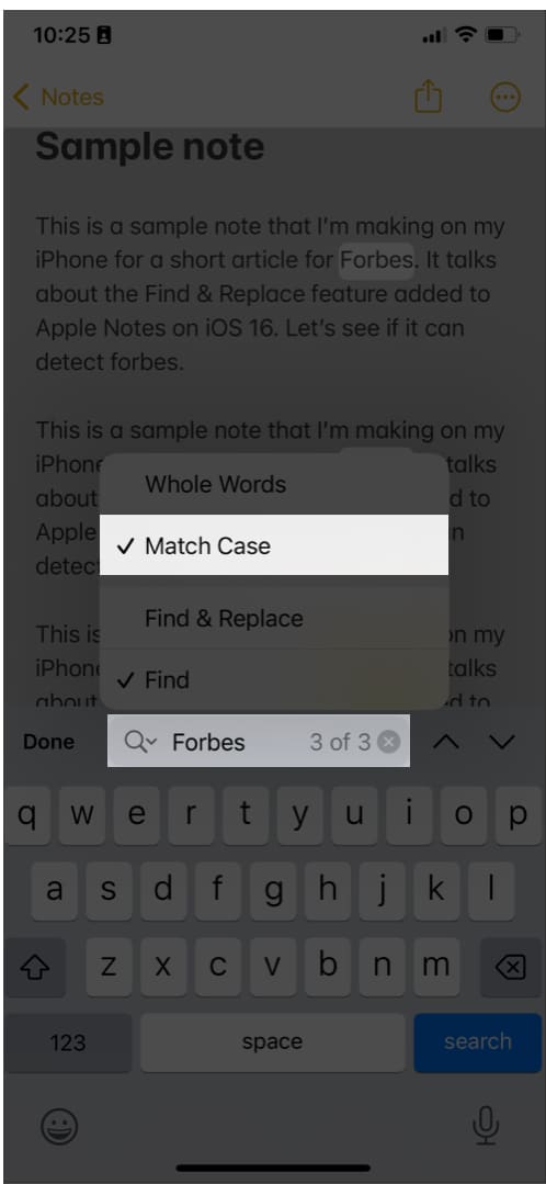 Som navnet antyder, lader denne funktion dig søge efter et ord eller en sætning på din note og fremhæve dem alle for dig. Funktionen giver dig mulighed for at erstatte dem med et valgt ord eller en sætning med det samme.