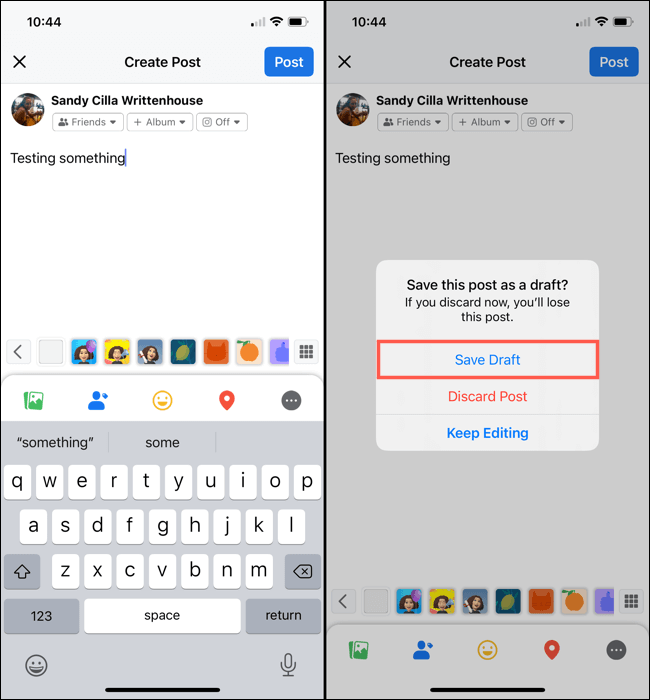 - Hvis du gemmer en Facebook-kladde på én enhed, synkroniseres den ikke med appen på dine andre enheder eller nettet. Nedenfor kan du se en gemt kladde på nettet og en anden gemt i Facebook-appen på iPhone.