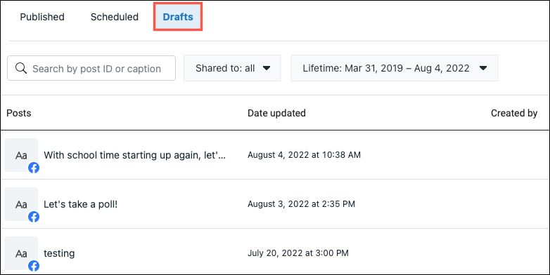 Kladder, som du gemmer til en Facebook-side, du administrerer, fungerer ganske anderledes. Du har en central placering med alle dine kladder, uanset hvor mange du har. Du kan derefter udgive, redigere eller fjerne kladder, du har gemt.
