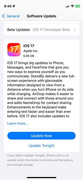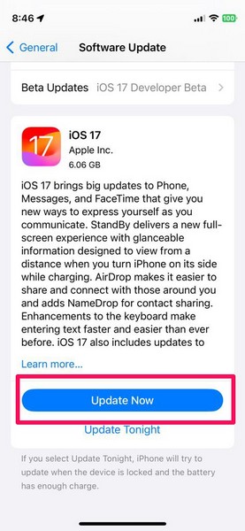 5.Når den seneste iOS 17-opdatering vises på skærmen, skal du trykke påOpdater nuknappen for at starte processen. Du kan også trykke påOpdatering i aftenknappen for at fortsætte processen på et bestemt tidspunkt om natten, når din enhed oplades.