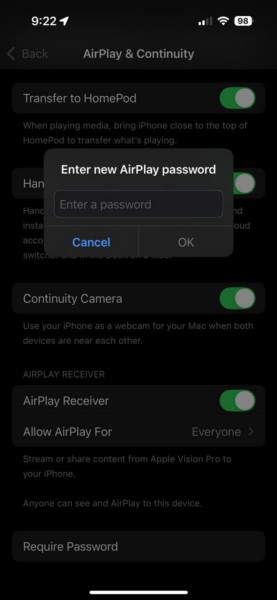 7.Du kan ogsåaktiver indstillingen Kræv adgangskodeog opret en ny AirPlay-adgangskode for at sikre forbindelsen.