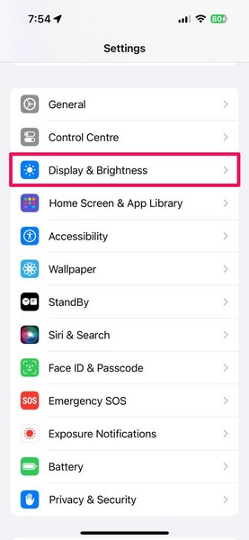 2.Tryk påDisplay & lysstyrkemulighed på listen.