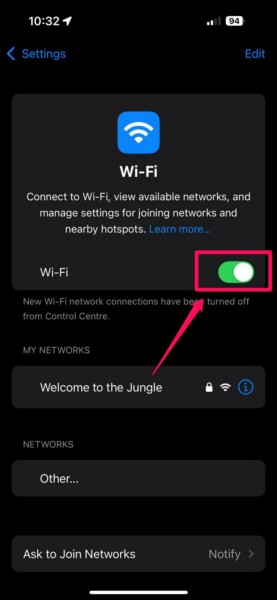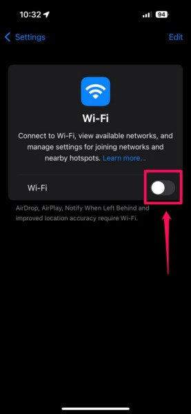 En anden simpel rettelse, der har virket til at løse problemet med AirPlay, der ikke fungerer på iPhone for mange brugere, er at slukke for Wi-Fi-funktionen og derefter tænde den igen. Dette kan slippe af med enhver netværksrelateret fejl, der kan forårsage, at AirPlay-funktionen ikke fungerer på iPhone og løser problemet med et par tryk.