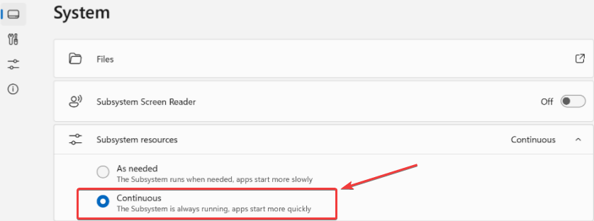 En anden løsning, der måske fungerer for dig, hvis Android-apps ikke virker på din Windows-pc, er at indstille WSA-ressourcer til kontinuerlig. Her er trinene til det samme –