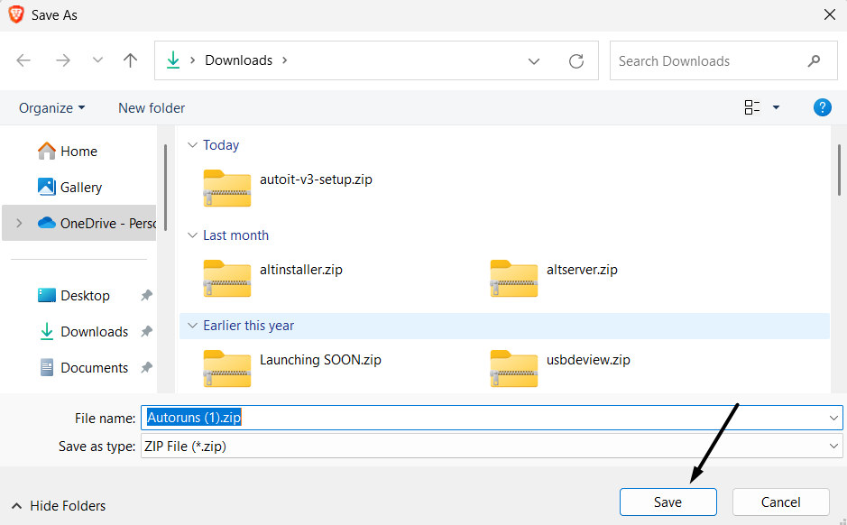 2.Klik påSpareiGem somvindue for at downloade Autoruns' eksekverbare fil på pc'en.