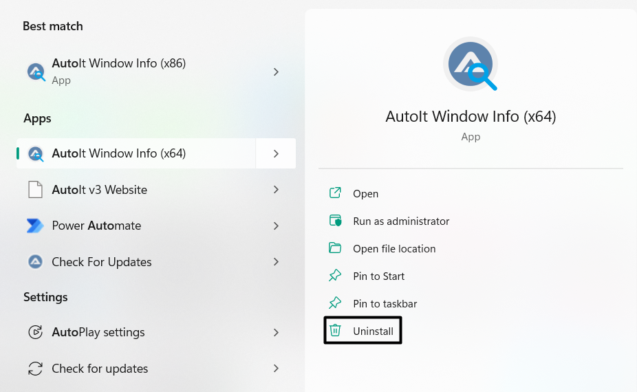 En nem måde at slippe af med AutoIt-fejl på Windows 11 er fuldstændigfjerne AutoIt-appenfra pc'en. Det vil helt sikkert løse problemet. Hvis du ikke har noget program med navnet "AutoIt" installeret på din pc,se efter et lignende programpå din computer. Du kan følge nedenstående trin for at vide, hvordan du fjerner det fra din pc: