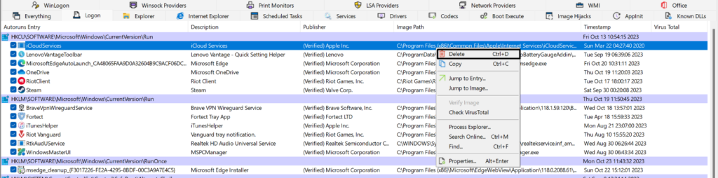 Hvis malware-scanningen ikke finder nogen mistænkelige filer på din Windows 11-pc, foreslår vi digsøg efter autorun-tasternepå den ogfjerne demved hjælp af Windows Autoruns. Dette skyldes, at det kan være muligt, at de resterende autorun-nøgler fra apps, der allerede er blevet fjernet fra din Windows 11-computer, nu fører til disse irriterende fejl. Følg nedenstående trin for at finde og slette disse nøgler ved hjælp af Windows Autoruns: