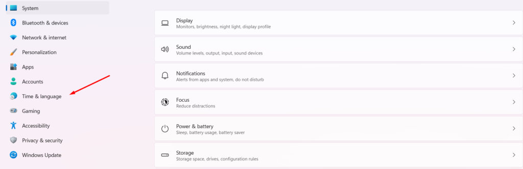 1.ÅbnIndstillinger app, og fra venstre navigationsrude skal du vælgeTid & sprogvalgmulighed.
