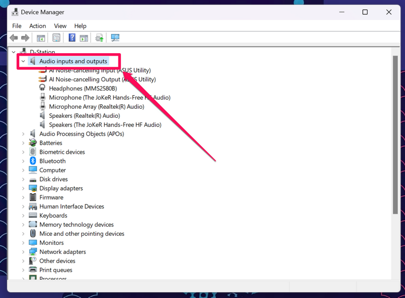 3.I denEnhedshåndteringvindue, udvidLydindgange og -udgangeved at klikke på den lille pil ved siden af.