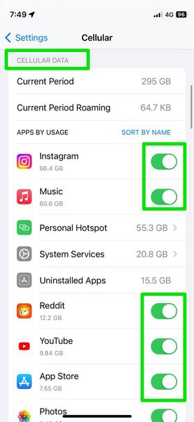 3.Nu,gennemse appsunderMobildata afsnitpå denne side for at kontrollere, om skiften for den app, du prøver at bruge, er aktiveret eller ej.